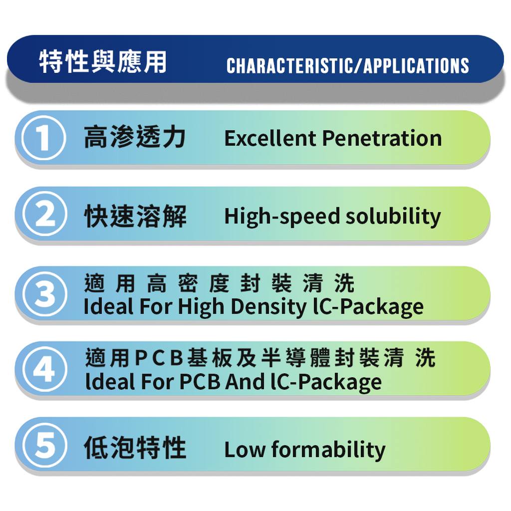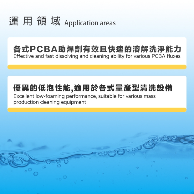 ETC-298S 半水基環保清洗劑, 億新科技基於低間隙產品特點開發, 應用於電子行業清洗〪能更有效去除低間隙及密集組件產品上最難去除的助焊劑及過程污染殘留, 特別是對於敏感金屬(如電子產品上的銅、 鋁、 錫、 鎳等)具有極佳的產品兼容性; 優異的低泡性〪較短的接觸時間及高污染負載情況下, 具有寬大的設備工藝應用窗口和長使用壽命, 有效降低運營成本〪